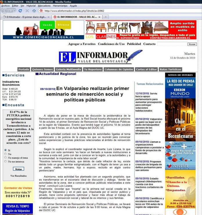 Inicio Noticias Noticia en diario regional sobre el primer seminario de Reinserción Social y... Noticias Noticia en diario regional sobre el primer seminario de Reinserción Social y Políticas Públicas Por super8 - 12 octubre, 2010 89 0 Facebook Twitter Pinterest WhatsApp Artículo relacionadosMás del autor Licenciatura 2024 Arica Día del Profesor 2024 FIESTAS PATRIAS 2024 EN COMPLEJO PENITENCIARIO BIO BIO EVENTOS DESTACADOS Décimo Quinto Aniversario de CORESOL coresol - 25 abril, 2011 Leer más